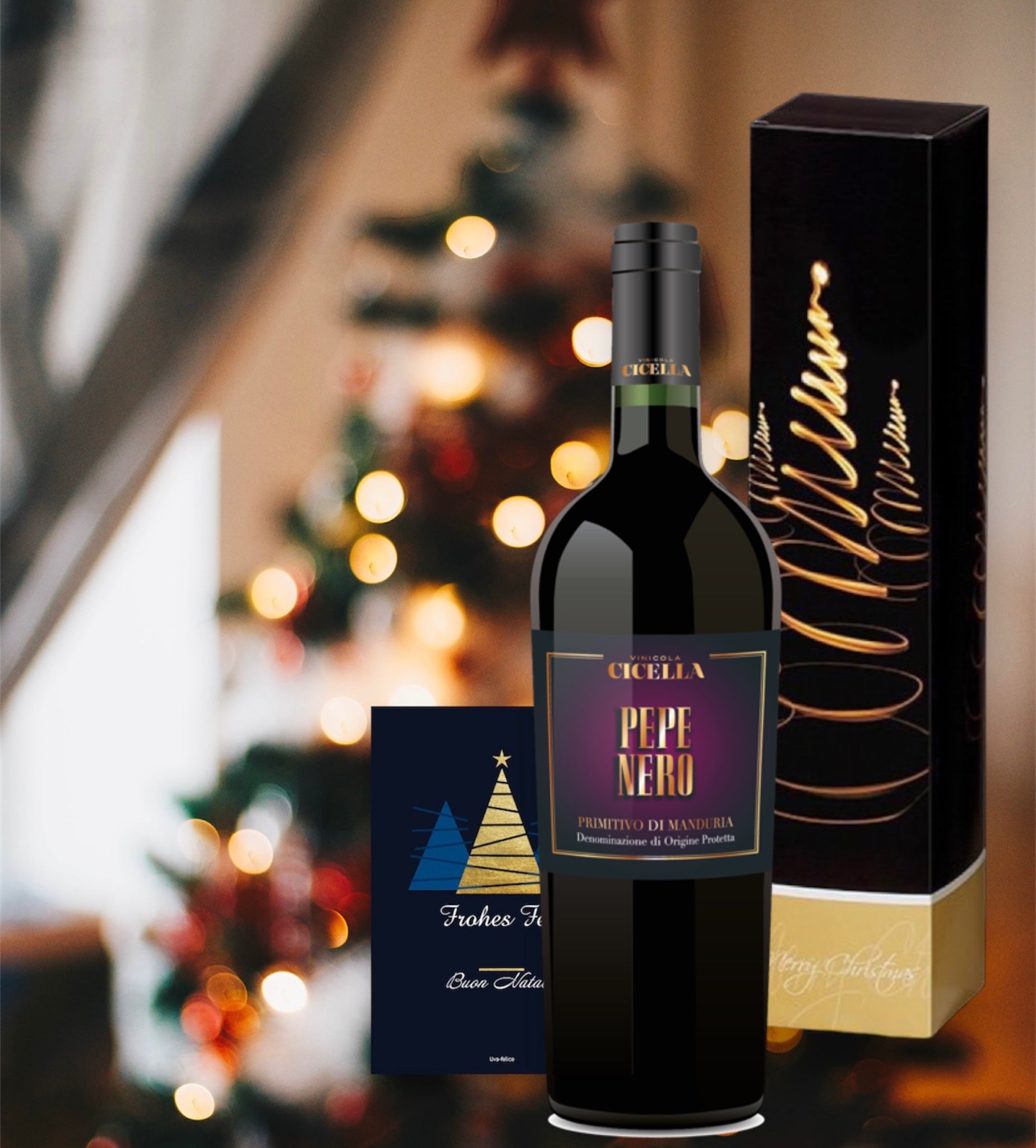 Mache Weihnachten unvergesslich – mit einem Hauch Gold und dem außergewöhnlichen Geschmack des Pepe Nero Primitivo. 🌟🍷